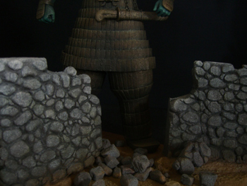 私の製作した大魔神は、シリーズ2作目の「大魔神怒る」をイメージして製作しました。 タガネが無くて金属色が少ない(?)‥等が、特徴です。従いまして、塗装は露骨に金属色を出さずに‥控えめに入れ、メタリック系をベースにクリア系カラーを使用し、仕上げました。今回の作品は、城壁を崩して悪者を睨みつけているシーンを再現する為に視線を下向きに‥血走った眼で睨みを効かせた仕上げにしてみました。城壁は、今回‥バルサフォームを削り出して使用し、ポリキュートで足元の土を作りました。
